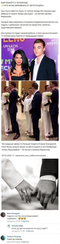 25 февраля 2020 года выяснилось, что бывшая подруга ведущей телестройки Ксении Бородиной Катя Жужа стала супругой состоятельного мужчины. Оказалось, что Артем Маркелов, в прошлом являвшийся бойфрендом прежней участницы телепроекта Алены Водонаевой, решил связать судьбу с другой представительницей прекрасного пола. Фолловерам известно о том, что уже в течение пары лет Артем поддерживает романтические отношения с Екатериной Жужей. К тому же на просторах Интернета говорили и о том, что в прошедшем году эти двое даже осуществили тайную роспись в Лас-Вегасе. Накануне в виртуальном пространстве были опубликованы первые фотографии и видеоролики, созданные в ходе бракосочетания Кати и Артема. Церемония была проведена весьма скромно, Жужа и ее возлюбленный приехали в ЗАГС в сопровождении лишь самых близких друзей и родственников. К тому же невеста даже не стала надевать роскошный свадебный наряд, выбрав для такого дня обычный белый костюм. При этом торжественный момент все же заставил Екатерину прослезиться. Посетители социальных сетей заметили, что новоиспеченные молодожены кажутся действительно счастливыми и горячо любящими друг друга. Подписчики с удовольствием пожелали Маркелову и Жуже прочного и долговременного союза. Видеозапись, посвященную свадьбе Кати Жужи и Артема Маркелова, все желающие могут увидеть здесь.