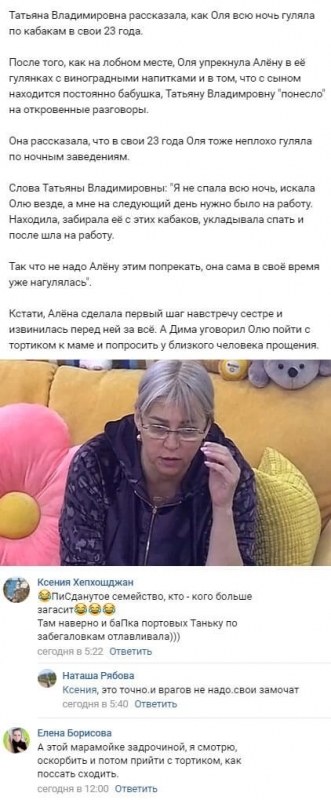 28 февраля 2020 года Григорьевская-старшая, стараясь защитить и представить в более выгодном свете младшую дочку, без колебаний выдала вторую наследницу. Ни для кого не секрет, что Ольга Рапунцель охвачена подлинной яростью из-за случившейся у нее грандиозной ссоры с членами ее семьи. К тому же после долгих раздумий супруга Дмитрия Дмитренко определила, кто именно виновен в ее конфликте с родительницей. Оля решила, что причина недопонимания между нею и матерью заключается в сестре Рапунцель Алене Савкиной, которая, как всем прекрасно известно, является любимицей Татьяны Владимировны, в отличие от самой Ольги. В процессе одного из состоявшихся недавно семейных советов нервная система женщины, готовящейся к рождению младенца, не выдержала происходящего. Рапунцель решилась сравнить себя с Савкиной, причем в ее устах такое сравнение прозвучало отнюдь не в пользу мамы годовалого Богдана. Оля твердо и во всеуслышание заявила о том, что она однозначно не позволяет себе столь легкомысленного и распущенного поведения, как Алена, не поглощает волшебные напитки и не бывает в караоке. К тому же старшая из сестер заметила, что она собственными силами растит малышку, тогда как Савкина фактически не интересуется своим ребенком. Мать Алены и Ольги немедленно принялась защищать младшую дочь. Пытаясь оправдать маму Богдана, старшая Григорьевская стала вспоминать о том, насколько небезупречно прежде вела себя и сама Рапунцель. Как утверждает Татьяна Владимировна, ей нередко приходилось являться за Олей, которой в то время было 23 года, как и сейчас Алене, в развлекательные заведения. В ночное время суток Григорьевская-старшая обходила буквально все соответствующие места на территории Владивостока, а затем женщина, уложив непутевую дочку спать, спешила на работу.