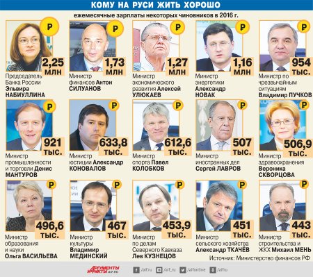 Дело, видимо, в том, что сознание слуг народа определяет совсем другое бытие. По данным Минфина, которые привёл РБК, зарплата Антона Силуанова, главы ведомства, превысила среднюю по стране в 47 раз и составила 1 млн 730 тыс. руб. в месяц. Главы Минэкономразвития Алексей Улюкаев (которого в течение всего 2017 г. судили за взятку и в итоге приговорили к 8 годам колонии) и Максим Орешкин в 2016 г. получали по 1 млн 220 тыс. руб. (в 33 раза больше среднего). Среди тех, чьи доходы были раскрыты (не опубликованы зарплаты министров силового блока и президента), больше всего порадовала своими успехами глава Центробанка Эльвира Набиуллина - её заработок превысил средний по стране в 61 раз и составил 2 млн 250 тыс. руб. Самыми скромными оказались зарплаты членов Совета Федерации - 385 тыс. руб. в месяц, или всего в 10,5 раза выше средней по России. А вот средняя зарплата всех федеральных чиновников составила в 2016 г. «всего» 116 тыс. руб. - следует из данных Росстата.