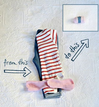 2. Чтобы сохранить место в рюкзаке, шкафах, машине не складывайте, а сворачивайте одежду. Кстати, так она не мнется. Маленький, но очень полезный лайфхак.