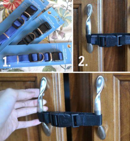 4. Чтобы предостеречь «любопытную Варвару» от неприятных находок, закрепите ручки шкафов обычным ошейником для собак — они намного дешевле блокираторов для детей. Например, блокиратор в онлайн-магазине «Детский мир» стоит 99 рублей, а капроновый ошейник в онлайн-магазине для животных petshop.ru — всего 68.
