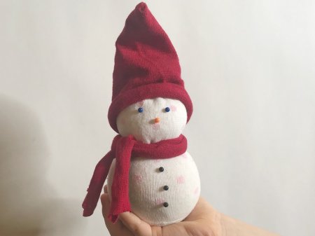 Делаем колпачок. Для этого отрезаем мысок длиной 10-12 см у другого носка, желательно – контрастного цвета. Из него же делаем снеговику шарф (узкая полоска ткани). Или шьем колпачок сами.
