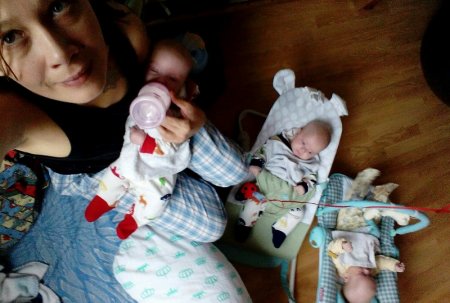Москвичка Мария Баранчикова рассказывает о том, как живется маме тройни в первые дни после выписки из роддома. Героический муж взял недельный отпуск Я не готовилась к материнству. Да, все формальности вроде покупки кроватей, бутылочек, одежды и ещё тонны оказавшихся ненужными вещей были соблюдены. Но осознание «Ого! Да я ж теперь многодетная мать, нет, не так, МАТЬ, мать тройни!» пока не пришло. Думаю, торжественность момента нагонит меня к выпускному дочек. В первые дни дома я отлаживала режим, доставшийся мне и детям от роддомовского расписания кормлений. Правда, теперь в него требовалось впихнуть хлопоты по хозяйству, общение с мужем, пятью котами и чуть-чуть сна, так, в косметических объёмах. (Важная ремарка для всех беременных: впрок выспаться невозможно, но всё равно – спите. Спите так, словно это ваша последняя возможность, спите в любое свободное время, бросьте все дела и спите. Сон. Спаааать. «Спать» – само это слово будет приводить вас в возбуждение, сопоставимое с сексуальным). Героический муж взял недельный отпуск, во время которого заботливо готовил еду, возился с дочками и отпускал меня покутить с цыганами, ой, пардон, на работу для оформления документов и на встречи с подругами. Дети быстро освоились дома, а коты пришли с табличкой «Верните ЭТИХ туда, откуда взяли». Кстати, чуть не забыла представить «этих»: Варвара и Полина (близнецы, но не двойняшки) и их сестра Ульяна. Нет, они все разные и внешне, и по характерам. Вообще. Так что шах и мат, верующие в гороскопы! Имена мы выбрали с мужем, почти не сговариваясь, просто за красоту и среднюю степень вычурности. Теперь, наверное, будем сильно выделяться среди Забав, Василис, Смеян и прочих хорошо забытых славянских прозвищ (простите, если кого обидела). Молокоотсос был заброшен подальше Самой большой сложностью поначалу была попытка наладить грудное вскармливание. В своё время, когда раздавали мозги и сиськи, я опоздала в обе очереди, и довольно скоро стало понятно, что мои девушки охотнее едят смесь и даже пытаются сами держать бутылки. Так что грудное молоко шло бонусом самой маловесной из тройни. Разумеется, я читала тонны литературы про то, как увеличить количество молока и организовать сцеживание. Чайный сбор для кормящих лился из ушей, от чая с молоком меня откровенно мутило, да и организм, просидевший восемь месяцев без нормального кофе, отказывался функционировать нон-стоп без стимуляторов, а почки поскрипывали и подвывали от хлынувшего счастья. Моё грудное вскармливание завершилось после прочтения на тройняшном форуме рекомендации в духе «в первые месяцы организуйте себе матрас на полу, переносной холодильник и молокоотсосную станцию рядом с ним, разложите детей и отлучайтесь только на пописать». Поскольку я изначально взяла курс на раздельный сон, а барышни получили собственную комнату, молокоотсос был заброшен подальше, а насилие над грудью закончилось. Нет, чувства вины я не испытываю. Где-то в мире существуют отважные матери, выкормившие тройни только своим молоком (и единороги). Наверняка у тех и у других – неплохой штат помощников, нянь и личных пиар-агентов. Но в мой бюджет такие траты не входили. В нашей семье получили широкое распространение новые «виды спорта» При выписке из роддома мне выдали четвертинку листа А4 с основными рекомендациями по уходу за д