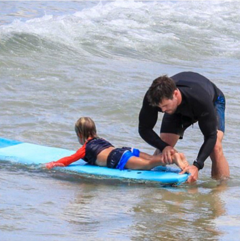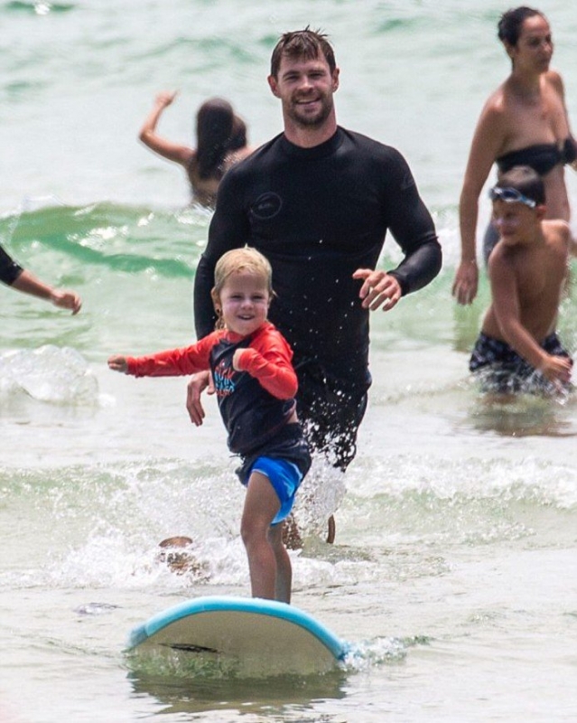 Свою любовь к серфингу австралийский актер Крис Хемсворт никогда не скрывал. Каждый раз, когда он возвращался на родину в Австралию, Крис отправлялся ловить волну на океане. В сети немало эффектных снимков с Хемсвортом на доске, и своим пристрастием к этому виду спорта актер решил поделиться с трехлетним сыном Сашей.