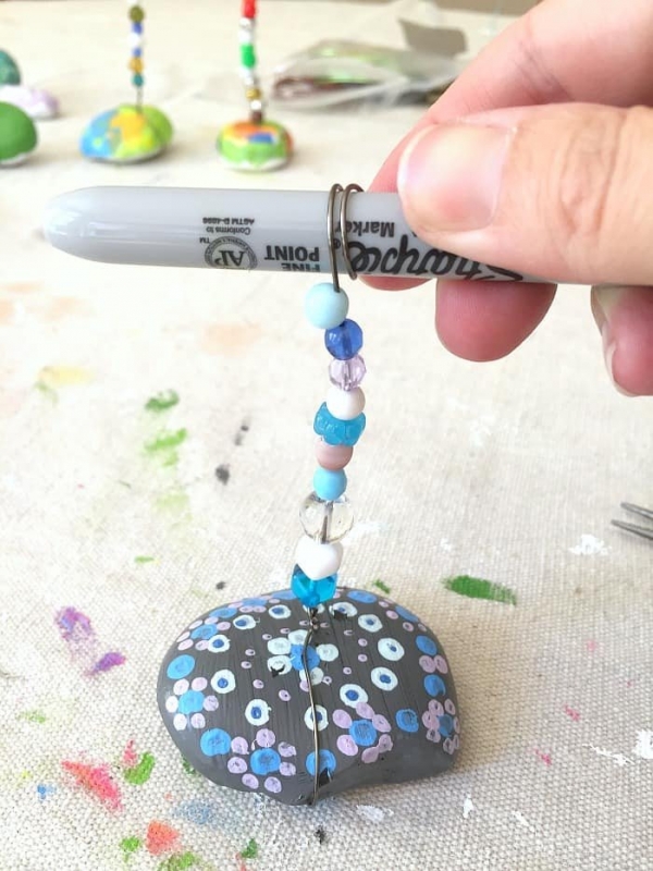 На следующий день,после полного высыхания герметика, пора добавить проволоку в камень. Это задача для взрослого. Нужно подыскать такую проволоку, которая будет проходить через выбранные вами бусины. Возьмите за кончик проволоки и придержите его, далее оберните проволоку вокруг камня один раз, скрутите ее пальцами, а затем осторожно затяните плоскогубцами, чтобы она не соскользнула.