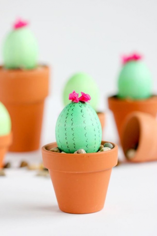 На Пасху даже привычные суккуленты и кактусы можно заменить вазонами, сделанными из выдутых яиц. Главное – раскрасить пустое яйцо под настоящий кактус и подобрать к нему маленькую емкость. Симпатичная поделка на Пасху, с которой справится даже дошкольник.
