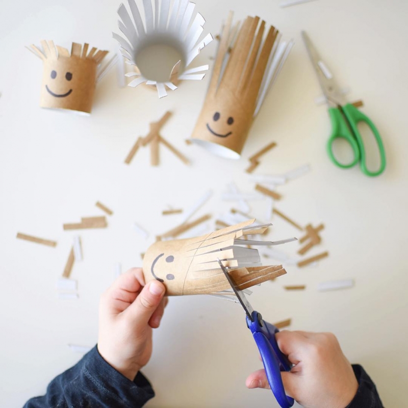 Мы уже рассказывали о том, что можно сделать из картонных втулок от туалетной бумаги. Вот еще один способ их использования: нарисуйте на втулках забавные лица человесков, сделайте глубокие надрезы, имитирующие волосы. Пусть ребенок посредством ножниц сделает человечкам новые прически.
