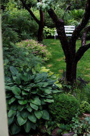 Летом листва хосты полностью закрывает то, что осталось от тюльпанов