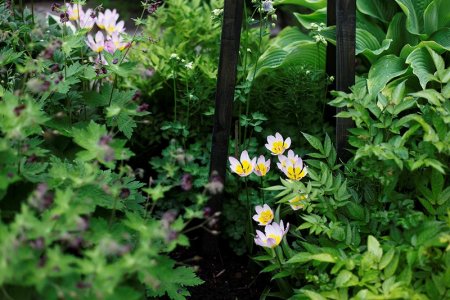 Очень советую для выращивания тюльпаны природных видов — тюльпан поздний, тюльпан Кауфмана, тюльпан льнолистный. Они нежные, очень красивые, небольшие. Им хорошо в легкой тени, а отцветающие растения скроют листья хост, гераней, бузульников.