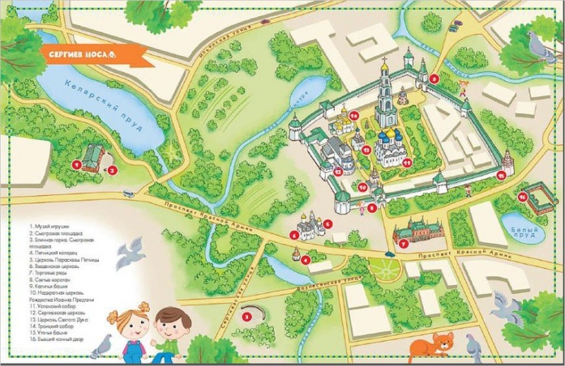 Первой точкой назначения будет Сергиев Посад. Обязательны для посещения:1. Музей игрушки 2. Матрешка художника Малютина 3. Новые торговые ряды 4. Часовня над Пятницким колодцемГлавная улица — проспект Красной Армии. Подъезжая по нему к монастырю, издалека видно высокую монастырскую колокольню. Перед монастырем слева на высоком берегу пруда стоит красное кирпичное здание — Музей игрушки. Сергиев Посад давно славится производством деревянных игрушек. По преданию, еще Сергий Радонежский вырезал игрушки для крестьянских детей. Но настоящий игрушечный бум здесь начался с появлением матрешки.Задание для детей: Какое было мирское имя Сергия Радонежского, которое он носил в детстве?