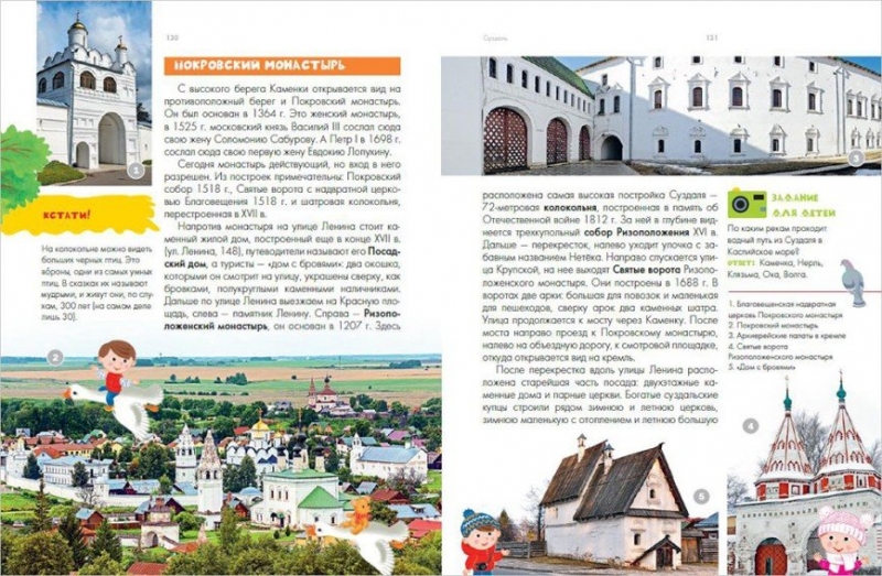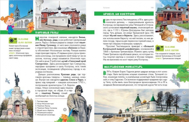 С путеводителем для детей «Золотое кольцо» каждый ребенок станет настоящим туристом! Изучаем варианты маршрутов. Золотое кольцо России — это туристический маршрут протяженностью около 700 км, рассчитанный на 4-5 дней пути. В него входят древние русские города, которые раньше были столицами самостоятельных княжеств: в каждом был свой кремль, свой князь, своя дружина. В них сохранились средневековые крепостные укрепления, боярские палаты, старинные церкви и монастыри. Города Ярославль, Кострома и Плёс расположены на живописных берегах Волги — великой русской реки. Маршрут начинается в Москве, проходит через 10 городов и, сделав круг, снова приводит в столицу. Поэтому он и называется «кольцо». В Золотое кольцо России традиционно включают восемь основных городов — Сергиев Посад, Переславль-Залесский, Ростов Великий, Ярославль, Кострома, Иваново, Суздаль, Владимир. Первой точкой назначения будет Сергиев Посад. Обязательны для посещения:1. Музей игрушки 2. Матрешка художника Малютина 3. Новые торговые ряды 4. Часовня над Пятницким колодцемГлавная улица — проспект Красной Армии. Подъезжая по нему к монастырю, издалека видно высокую монастырскую колокольню. Перед монастырем слева на высоком берегу пруда стоит красное кирпичное здание — Музей игрушки. Сергиев Посад давно славится производством деревянных игрушек. По преданию, еще Сергий Радонежский вырезал игрушки для крестьянских детей. Но настоящий игрушечный бум здесь начался с появлением матрешки.Задание для детей: Какое было мирское имя Сергия Радонежского, которое он носил в детстве? Следующий город для визита - Переславль-Залесский.Переславль-Залесский расположен на берегу Плещеева озера. Площадь озера около 50 квадратных километров, а максимальная глубина 25 метров. Но глубина начинается не сразу: метров 200-300 от берега можно пройти в воде по колено, а после дно резко уходит в глубину. За такую форму озеро прозвали «суповой тарелкой». Зимой на льду, где начинается глубина, обязательно сидят рыбаки: в этом озере водится уникальная пресноводная сельдь — ряпушка. В XVII веке тысячи свежих и копченых ряпушек отправляли отсюда в Москву, к царскому столу. Ряпушка из Плещеева озера входила в коронационный обед и постное меню царского стола. Ее называли царской селедкой, и даже на гербе города нарисованы две рыбки.Задание для детей: Какие животные изображены на гербах городов Золотого кольца России? Соедини изображения этих животных, названия городов и их гербы. Кострома.Город Кострома был основан Юрием Долгоруким в 1152 году. На этом месте были дремучие леса, в них скрывались разбойники. Князь расправился с ними «морем пламенным», то есть приказал сжечь леса, и, когда стих этот гигантский костер, на выжженной земле основал Кострому. Обязательны для посещения:1. Торговые ряды 2. Улица Молочная гора 3. Памятник Ленину 4. Памятник Ивану Сусанину 5. Музей льна и бересты 6. Погремушка-шаркун 7. Ипатьевский монастырьЗадание для детей: Как называется травянистое растение, которое в Костроме мнут, чешут, прядут и ткут, чтобы получить ткань? В книге вы найдете описание каждой достопримечательности в городах Золотого кольца России, интересные факты из их истории, а также задания для любопытных исследователей. Хотите составить собственный маршрут и узнать больше о России на каникулах? Книга выпущена 