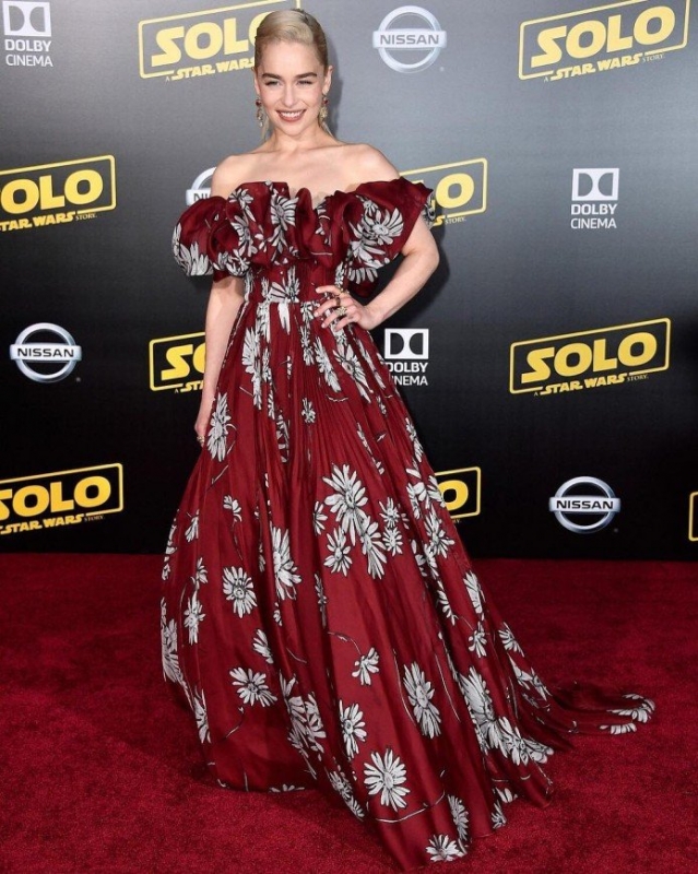 На премьеру фильма актриса пришла в роскошном платье от Valentino. Крупные белые цветы на бордовом фоне в сочетании с пышным подолом и открытыми плечами придали Эмилии женственность и утонченность, а потому ее образ был расхвален многочисленными поклонниками со всего мира. Однако критически настроенная публика все равно нашла к чему прицепиться.