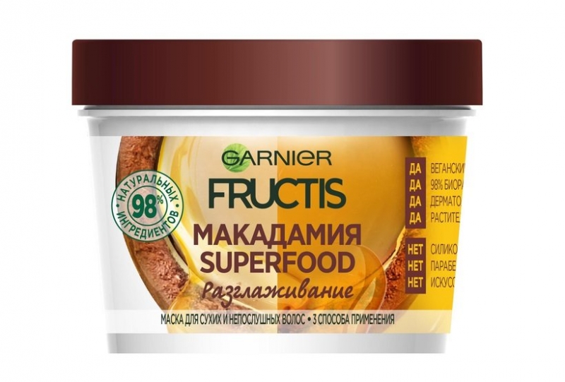 Невинное удовольствие для твоих волос – SuperFOOD с ароматом Макадамии. Маска для сухих и непослушных волос от Garnier придает им мягкость и гладкость, интенсивно питает и упрощает расчесывание. Суперинновация для питания ослабленных и секущихся волос, которая состоит на 98% из натуральных ингредиентов и имеет 3 способа применения: как бальзам, как маска и как несмываемый уход. Орех макадамия известен своими свойствами делать волосы мягкими, послушными, разглаживать их по всей длине. Формула не содержит парабенов, силиконов и искусственных красителей.