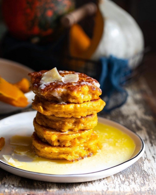 Фотобанк Тыква — продукт уникальный и универсальный. С ней можно приготовить любой блюдо, от каш до десертов. Если вы все еще обходите эту красавицу стороной в супермаркете, пора исправляться. Включайте ее в рацион, так вы получите нужные витамины, макро- и микроэлементы, а также добавите красок в свое меню. Предлагаемые рецепты вам обязательно в этом помогут. Автор фото и рецепта Агния: instagram.com/mykitchenrulez/ ТЫКВЕННЫЕ ОЛАДЬИ С СЫРОМ Ингредиенты: 250 гр тыквенного пюре (запечь и измельчить тыкву)80 гр густого йогурта или сметаны2 больших яйца30 гр натертого пармезанаСоль, перец по вкусу1 ч. ложка разрыхлителя130 гр мукиОливковое масло для жаркиСливочное масло, зелень для подачи Процесс приготовления: 1. В большой миске смешать тыквенное пюре, яйца, соль, перец, сметану, сыр и разрыхлитель. Затем вмешать муку, тесто должно получиться довольно густым.2. Выкладываем на хорошо разогретую сковороду, смазанную маслом по 1 столовой ложке теста, жарим на небольшом огне с двух сторон.3. Готовые оладьи полить растопленным сливочным маслом.