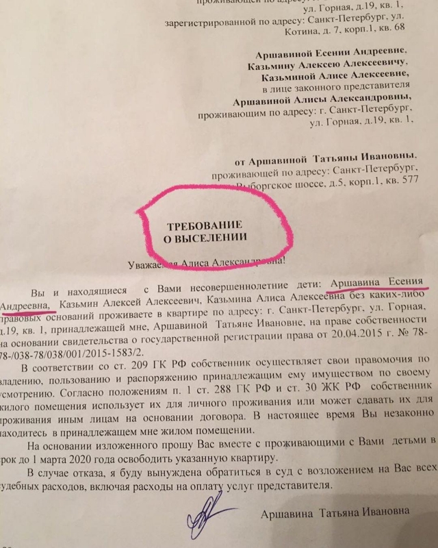 Андрей и Алиса Аршавины Год назад супруга Андрея Аршавина и мать его дочери Есении Алиса заявила, что разводится с футболистом. По ее словам, спортсмен постоянно общался с другими девушками, а некоторые его измены становились достоянием общественности. Но, несмотря на то что после развода прошел почти год, неприятности Алисы и ее детей продолжаются. В микроблоге экс-супруга футболиста рассказала, что в день рождения дочери получила уведомление о выселении. Свои слова Алиса подтвердила фотографией документов, иронично заметив, что такой подарок папа и бабушка преподнесли внучке на день рождения. Уведомление о выселении Не забыла Алиса упомянуть и гражданскую жену Андрея Аршавина, Юлию Барановскую. Она заметила, что телеведущая смогла отсудить у футболиста недвижимость и крупную сумму алиментов, а сама Алиса не претендовала ни на что, кроме квартиры. Выселение, по ее словам, стало возможным из-за того, что квартира принадлежит матери Андрея, поэтому не считается совместным имуществом. Алиса Аршавина