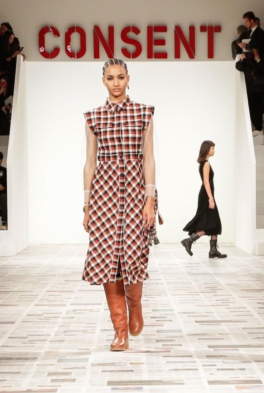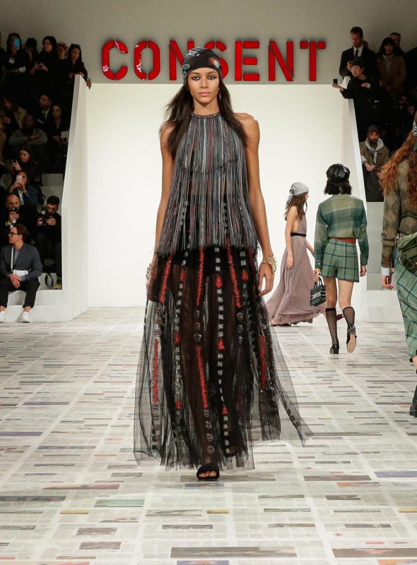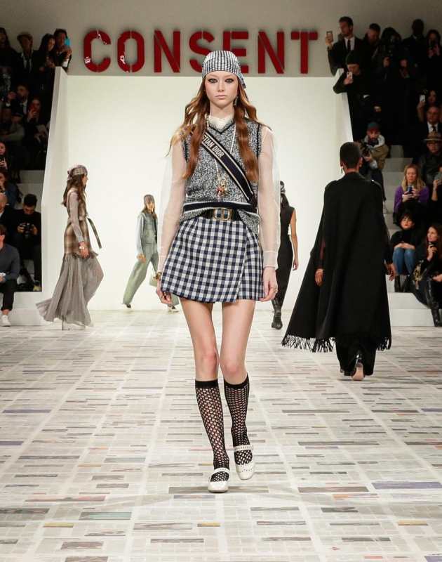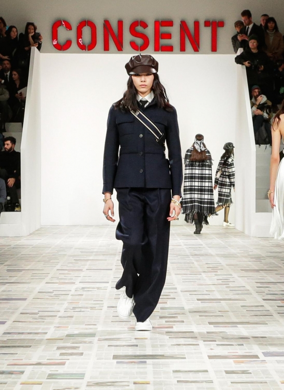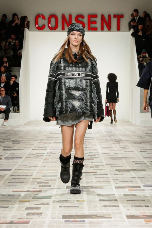 Стоить уделить отдельное внимание сценографии показа, которую создало объединение французских художников, носящее имя Claire Fontaine.Клэр Фонтейн является автором неоновых вывесок-манифестов — по задумке автора, они являются своего рода субтитрами, рассказывающими как реальность может (и должна) восприниматься, если бы оно было бы продиктовано мужской точкой зрения.Пол павильона, в котором прошел показ, она также украсила своей работой Newspaper, состоящей из копий страниц французской ежедневной газеты Le Monde.