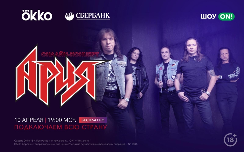 Группа «Ария» с 1985 года остается одним из самых популярных метал-коллективов страны. Живые выступления группы — это всегда мощный драйв и энергетика. Сразу после выхода первого альбома композиции «Арии» стали лидерами хит-парадов. Всего в дискографии группы 13 номерных альбомов, а также многочисленные концертные записи и сборники. «Ария» продолжает работать над созданием нового материала, успешно гастролирует по России и за рубежом. «Шоу ON!» — проект с живыми концертами от Сбербанка и мультимедийного сервиса Okko, созданный, чтобы радовать поклонников музыки, которые оказались лишены шоу любимых исполнителей из-за отмены массовых мероприятий, а также призванный сделать искусство доступным для всех жителей России и мира. Live-выступления рок- и поп-звезд проходят в Okko каждую пятницу и субботу.