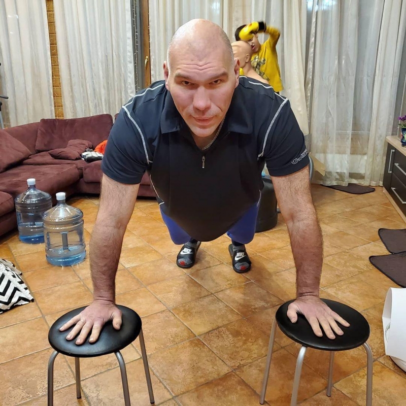 В Инстаграме Николай опубликовал два видеоролика, в которых показал, как занимается дома. В свои тренировки Валуев по-прежнему включает элементы бокса, без дополнительного оборудования или с боксерской грушей, которая также понравилась и его младшему сыну, а также качает пресс и отжимается.Среди подручных средств, которые Николай Валуев приспособил для домашних тренировок — 5-литровые канистры с водой, используемые им для различных упражнений на руки, и табуретки, подходящие для отжиманий.