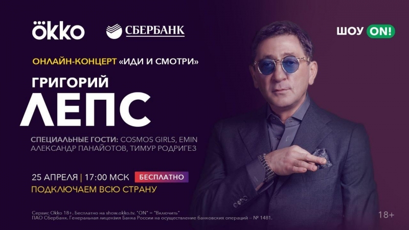 Заслуженный артист России, лауреат многочисленных премий и обладатель одного из самых узнаваемых голосов на нашей эстраде — Григорий Лепс выступит с новой концертной программой «Иди и смотри» на платформе онлайн-кинотеатра Okko. Зрители концерта услышат любимые хиты артиста, его премьеры и песни, которые давно не исполнялись на сцене. Григорий Лепс: «Все, что нужно для отличного субботнего вечера — это открыть Okko и включить «Шоу On!». Я и мои друзья сделаем все, чтобы вам было здорово. Уверен, никому не избежать хорошего настроения!»