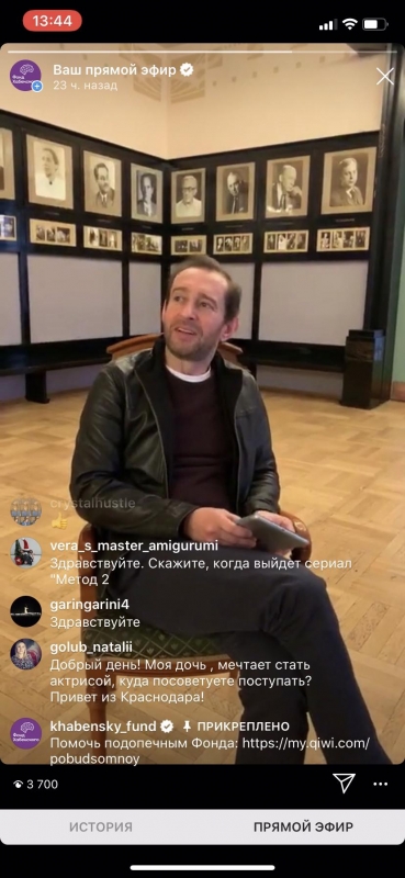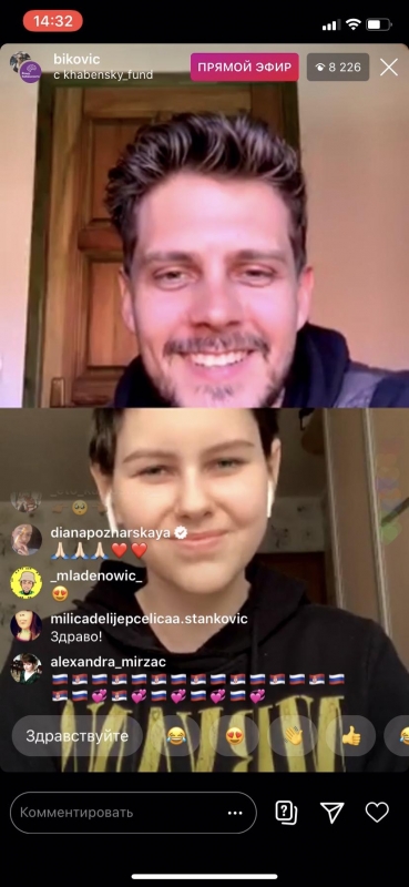 Константин Хабенский Первым в прямой эфир вышел основатель Фонда Константин Хабенский, а затем к акции присоединились еще 24 актера, музыканта, спортсмена и блогера. Во время трансляций они не только помогли маленьким зрителям почувствовать свою поддержку в это тревожное время, но и собрали 826 266 рублей, которые будут направлены на помощь детям с опухолями мозга. Милош Бикович Основная часть эфиров прошла в формате совместных трансляций звездных друзей и подопечных Фонда, к которым присоединялись дети из разных регионов. Для многих из них встреча в прямом эфире со звездой стала исполнением мечты: трехлетняя Серафима спела вместе с Полиной Гагариной «Драмы больше нет» — свою любимую песню из репертуара певицы, восьмилетний Влад, который до болезни занимался спортивной гимнастикой ивыступал на соревнованиях, познакомился со своим кумиром Артуром Далалояном. С любимыми артистами — Милошем Биковичем и Zivert — пообщались также шестнадцатилетняя Аня и десятилетняя Линда, а актриса Александра Ревенко провела артикуляционную разминку для семилетней Таисии и ее сестры, которые занимаются в театральной студии. Нюша Диана Пожарская, актриса, участница живых включений
