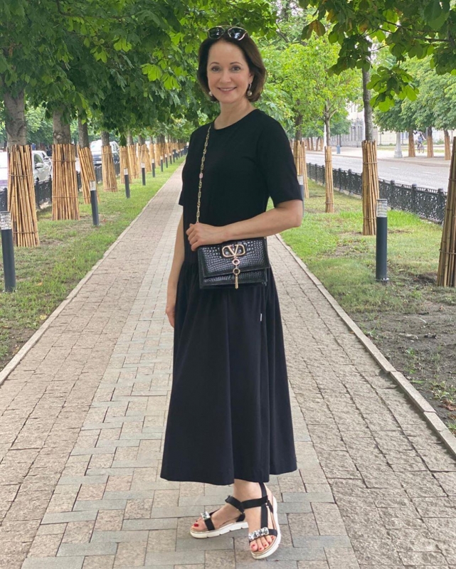 Фанаты обратили внимание на наряд актрисы — она выбрала для прогулки длинную черную юбку, простую футболку в тон, летние сандалии и небольшую сумочку на цепочке. Сама Ольга считает, что образ в черном цвете в любой ситуации будет выглядеть стильно и элегантно. А вы как думаете?