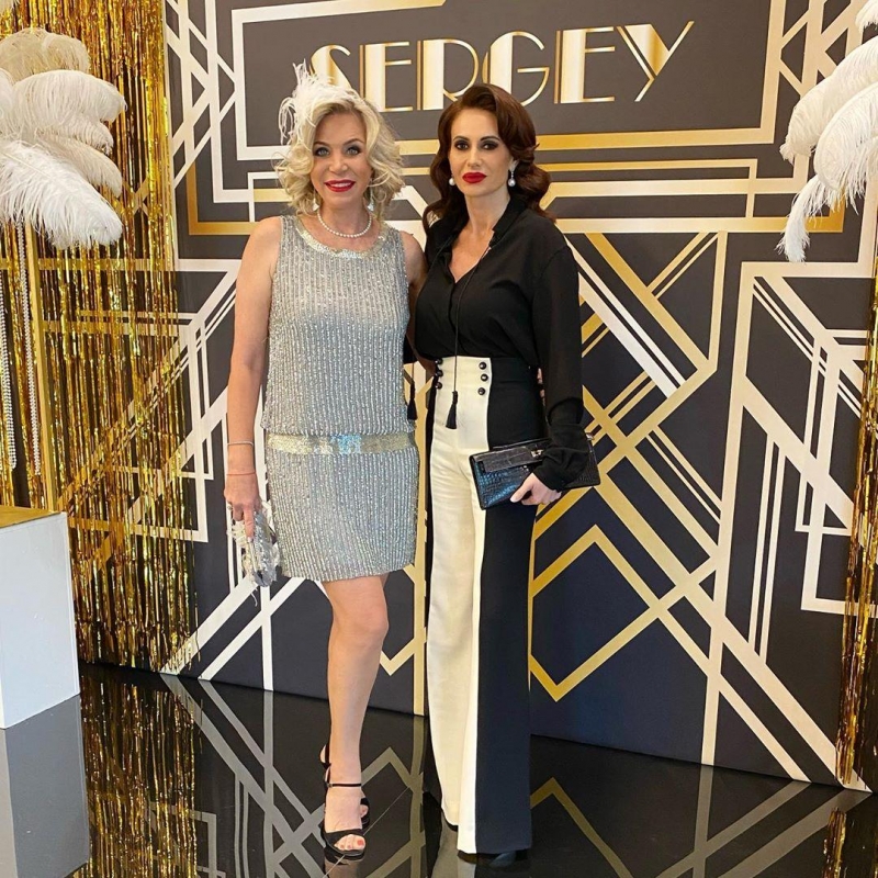 Для появления на дне рождения Марина выбрала наряд в стиле 20-х годов прошлого столетия. На Юдашкиной красуется короткое серебристое платье с заниженной талией, которое подчеркивает ее стройную фигуру. Дополнили наряд босоножки, крошечная сумочка и украшение на голове. Макияж с акцентом на губах завершил образ.