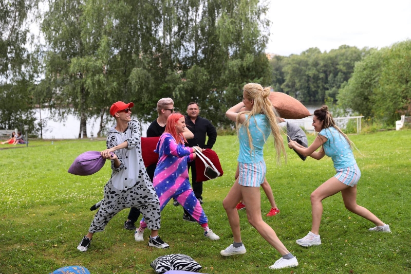 Перекусив, участники пикника перешли к более решительным действиям — отчаянному бою подушками! Участники разделились на две команды — блогеры и музыканты. Так, Тимоха Сушин и Андрей Сморжок сражались со Златой, Волгой и Катей из группы Queens.Не обошлось и без дискотеки. Алекс Балыков, НИНА, участники шоу «Голос» Влад Вэнгли и Наталья Корс исполнили песни не на привычной для себя сцене, а на диванах, траве и даже на больших подушках.