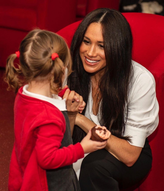 В микроблоге герцогов Кембриджских сегодня появилось неизвестное ранее фото Меган: жена принца Гарри на нем запечатлена во время общения с детьми, она присела рядом с маленькой девочкой и слушает ее, лучезарно улыбаясь.