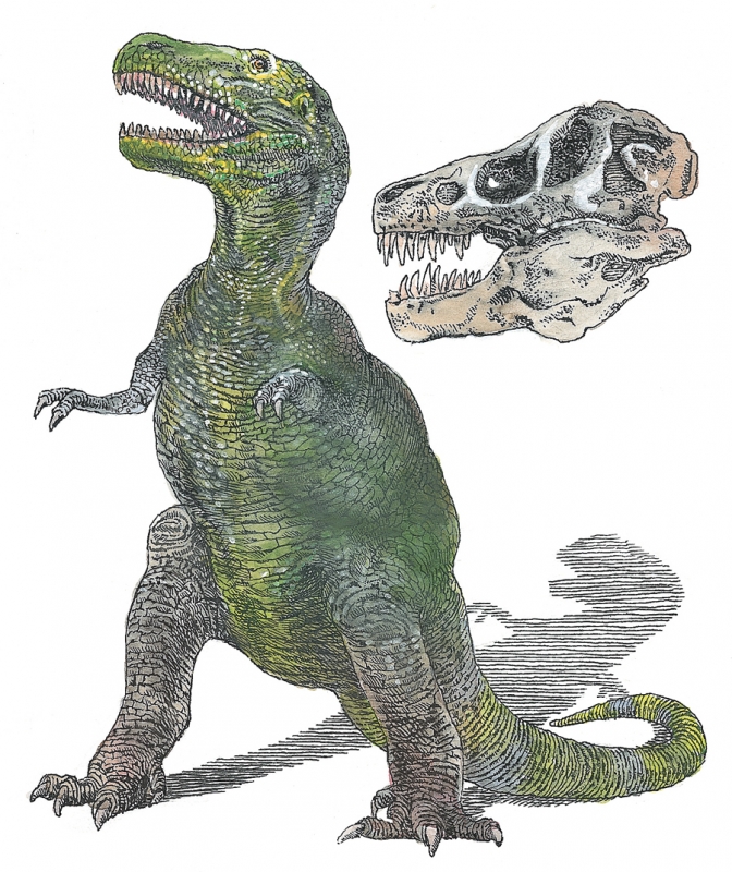 Эти новые хищники развернули охоту на травоядных динозавров. Самым большим и выдающимся из них был тираннозавр. Предположительно по размеру он был сопоставим с одноэтажным домом и весил не меньше слона. Тираннозавр обладал гигантским черепом и маленьким мозгом. Передние лапы у него были крайне малы и, вероятнее всего, почти не использовались. Совершенно иначе обстояло дело с зубами: изогнутые, с мелкими зазубринами, и на каждый можно было наколоть целого кролика.