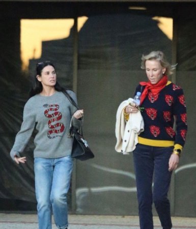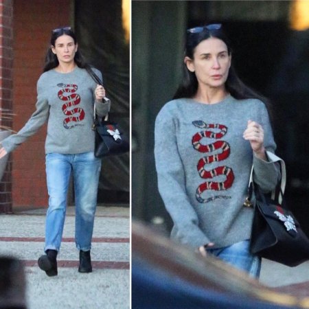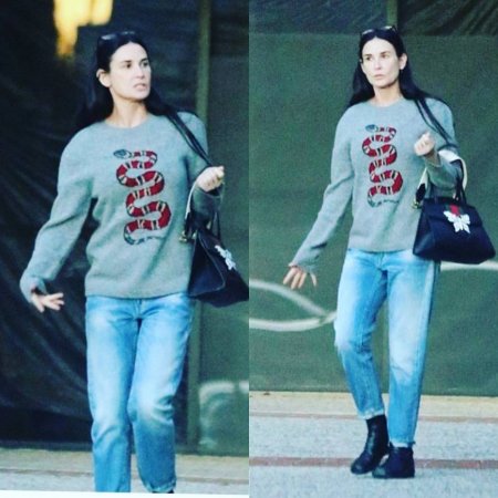 На актрисе был простой серый свитер с изображением змеи и прямые брюки из денима, дополненные черными кожаными ботинками и массивной сумкой в цвет. Однако наибольшее внимание привлекало лицо кинодивы, которое было без грамма косметики. Многие поклонники отметили, что время не властно над красотой Мур, но нашлись и те, кто с трудом смог узнать ее без макияжа.