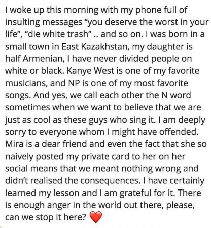 Фото вызвало бурную реакцию общественности и дошло до модели Наоми Кэмпбелл. Наоми прокомментировала это достаточно сдержанно: «Лучше бы это не было правдой». После потока возмущений, Ульяна Сергеенко опубликовала извинения, заверив всех, что она выросла в Казахстане, дочь ее наполовину армянка, поэтому она не делит людей на черных и белых, а Канье Уэст – один из ее любимых исполнителей и она использует «слово на букву Н» просто потому, что хочет казаться такой же крутой, как парни, которые поют песню NP (Niggas in Paris). Впрочем, видимо, извинения не были эффективными, потому что позже она их удалила.