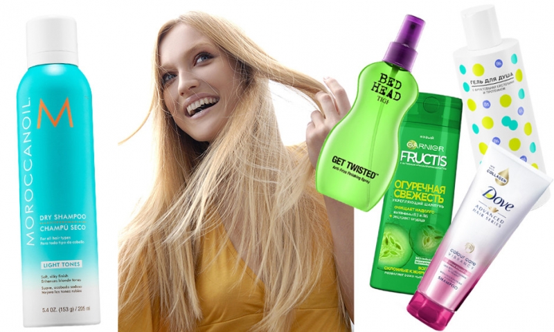 Укрепляющий шампунь «Огуречная свежесть», FructisГель для душа с фруктовыми кислотами и протеином, Honey BoneyШампунь для окрашенных волос Advanced Hair Series, DoveФинишный спрей для волос Get Twisted, TIGIСухой шампунь Light Tones, Moroccanoil