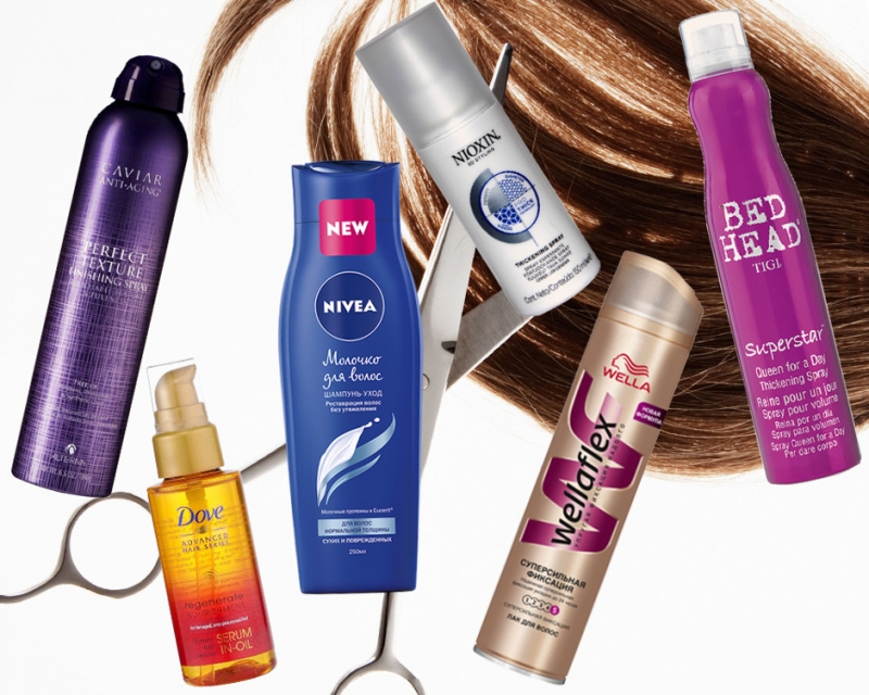 Спрей для придания объема волосам Bed Head, TIGI Лак для волос суперсильной фиксации Wellaflex, WellaСпрей для придания волосам объема и плотности Thickening Spray, NioxinМолочко для волос, NiveaМасло-сыворотка для волос Serum-In-Oil, DoveФинишный спрей для укладки Perfect Texture, Alterna