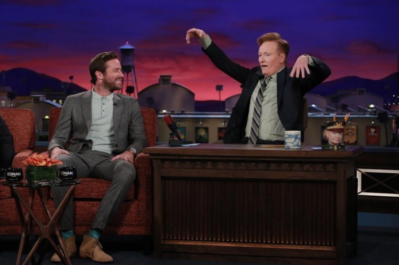 Арми Хаммер посетил шоу Конана О’Брайена в достаточно ожидаемом для звезды его масштаба наряде, что в случае с актером выглядит уже скучно — ведь он в последнее время любит появляться на публике в цветных спортивных костюмах, разрушая стереотипы и дресс-коды. И вот серый костюм. Хоть и поверх тенниски.