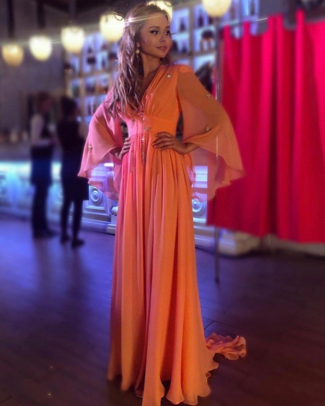 Однако сейчас Стеша сменила строгие линии на нежное платье персикового цвета, в котором посетила вечеринку друзей. Девичий оттенок, воздушная ткань, длинный подол и летящие рукава – необыкновенной красоты эксклюзивный наряд был сшит специально дня Стефании по индивидуальному эскизу и создал элегантный и изящный облик юной звезды.