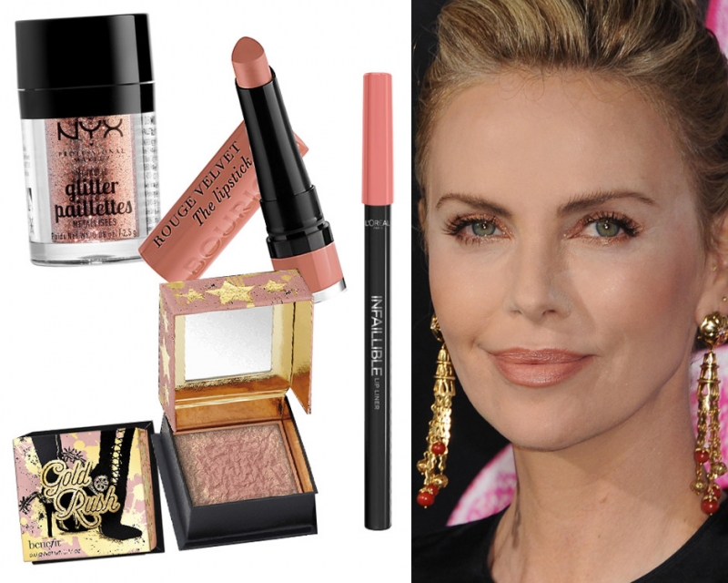 Бронза настолько универсальный оттенок, что подойдет и на лето, и на зиму: металлические тени можно использовать на веки и на скулы (в качестве хайлайтера) или создать монохромный макияж, подобрав к песочным теням персиковые румяна, карандаш и помаду для губ. Поскольку это достаточно сильный акцент, то волосы можно убрать назад, завязав в хвост или пучок. А в дополнение к образу смело бери длинные серьги — в этом тебе путеводной звездой будет актриса Шарлиз Терон.