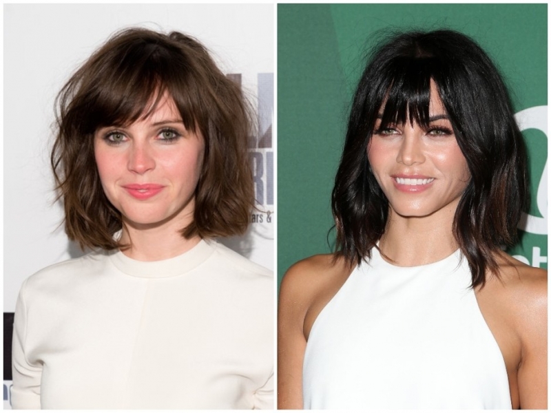 Фелисити Джонс (слева) и Дженна Деван (справа)Длинную челку чуть ниже бровей с прядями по бокам ввела в моду в 90-е топ-модель Хелена Кристенсен. И поскольку сейчас любят вспоминать добрым словом те годы, то и ту самую челку взяли на вооружение современные звезды. Правда, дело не только в ностальгии, но и в том, что именно таким способом можно смягчить крупный подбородок и квадратную форму лица. Между прочим, эта же челка подойдет и тем, кто в дальнейшем планирует от нее отказаться, но при этом не хочет мучиться с отращиванием — она постепенно уйдет в длину сама собой.