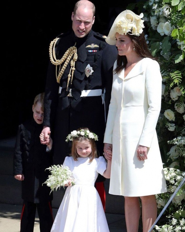 Кейт прибыла в часовню Святого Георгия в сопровождении мужа, герцога Кембриджского Уильяма, и двух старших детей, 5-летнего принца Джорджа и 3-летней принцессы Шарлотты. Для церемонии венчания герцогиня выбрала легкое пальто молочного цвета от Alexander McQueen, шляпку, декорированную цветами, из весенне-летней коллекции этого года от Philip Treacy и классические лодочки от Jimmy Choo. Самые внимательные поклонники Кейт разглядели даже кольцо с цитрином, которое, предположительно, она надевала на свой 26-й день рождения.