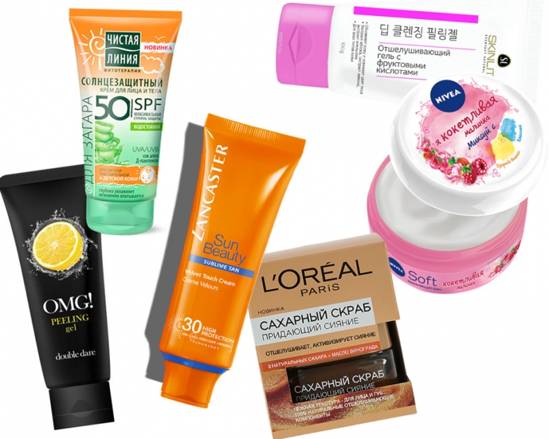 Нежный крем Sun Beauty Velvet Touch Cream, Lancaster Сахарный скраб, придающий сияние, L'Oreal Paris Крем «Я кокетливая малинка», NiveaОтшелушивающий гель с фруктовыми кислотами, SkinliteОтшелушивающий пилинг-гель Omg! Peeling Gel, Double DareСолнцезащитный крем для лица и тела, Чистая линия