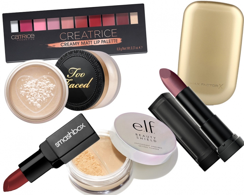 Компактная пудра Facefinity Compact Foundation, Max FactorМатовая помада Powder Matte, Maybelline NYМатовая палетка для губ Creatrice, Catrice Фиксирующая пудра Born This Way, Too Faced Помада Be Legendary, Smashbox Пудра Beauty Shield Setting Powder, e.l.f.