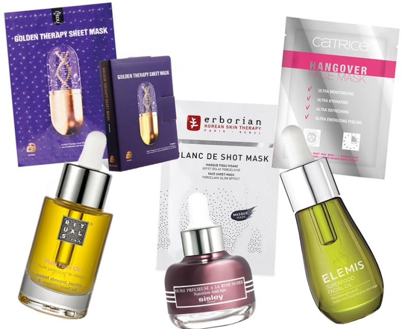 Увлажняющая и питающая маска для лица Golden Therapy Sheet Mask, NO:HJ; Тканевая маска Hangover Face Mask, Catrice; Масло Superfood Facial Oil, Elemis; Масло Nutrition Anti-Age, Sisley; Тканевая маска для сияния кожи Blanc De Shot Mask, Erborian; Масло Pure Face Oil, Rituals
