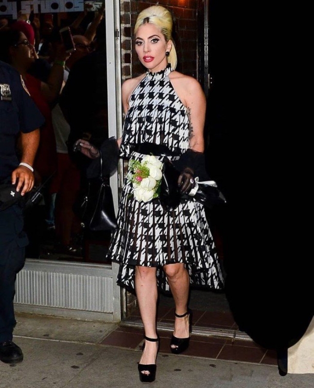 Леди Гага появилась на мероприятии в Нью-Йорке в совершенно нетипичном для себя туалете – перед взорами изумленной публики певица предстала в утонченном и элегантном образе, напомнив обывателям, что под всем привычными несуразными нарядами скрывается роскошная женщина.Черно-белое платье с принтом «гусиная лапка» продемонстрировало стройную фигуру дивы, классические стрелки акцентировали внимание на глазах, а изящная укладка, босоножки на высоком каблуке и классическая сумочка дополнили образ роскошной светской львицы.