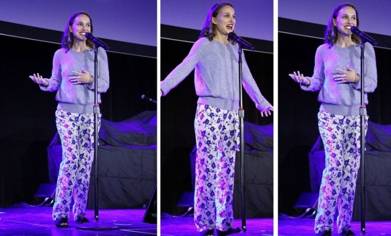 И вот на днях актриса приехала в свой ВУЗ, чтобы выступить с речью на фестивале музыки и кино Boston Calling Film and Music Festival. Для возвращения в родные стены Натали выбрала довольно неожиданный образ. На девушке красовались светлые брюки с ярким цветочным принтом, дополненные серым кашемировым свитером и открытыми черными босоножками с объемными бантами. Отсутствие укладки и очень легкий макияж озадачили поклонников черного лебедя еще больше, чем весь ее «домашний» стиль.