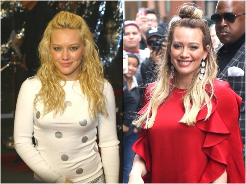Хилари Дафф в 2003-м и 2018 годахБезусловно, если хочется отрастить челку, то лучше всего убирать ее назад и закалывать, либо фиксировать лаком. В 00-х такая прическа еще и была в тренде. Сегодня, для того чтобы скрыть пряди, есть и другие, более оригинальные прически. К примеру, распущенные волосы с высоким пучком, с которыми в последнее время часто выходит в свет актриса Хилари Дафф.