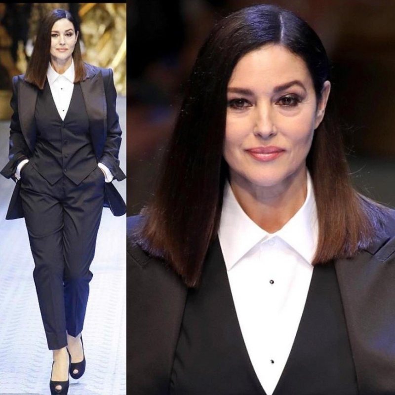 Женщина, много лет считающаяся эталон красоты во всем мире, Моника Белуччи, начинала свою карьеру в качестве модели, уже позже она увлеклась актерской профессией и редко выходила на подиум, а потом и вовсе перестала этим заниматься. На днях Белуччи сделала исключение и вспомнила модельные навыки, появившись на показе весенне-летней коллекции Dolce & Gabbana в Милане. Моника вышла на подиум в черном брючном костюме-тройке и белоснежной рубашке, на ее ногах красовались элегантные туфли-лодочки с открытым носом. Признанная красавица явно чувствовала себя уверенно и слегка улыбалась, придавая образу таинственности.