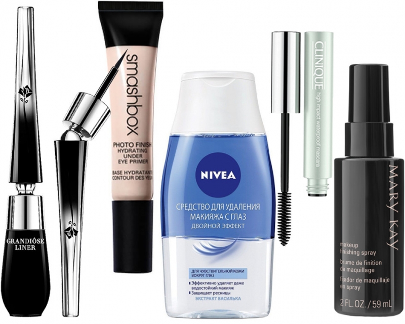 Лайнер для глаз Grandiose Liner, LancomeПраймер для глаз Photo Finish Hydrating, SmashboxСредство для удаления водостойкого макияжа, Nivea Гипоаллергенная тушь High Impact, CliniqueФиксирующий спрей для макияжа Makeup Finishing Spray, Mary Kay
