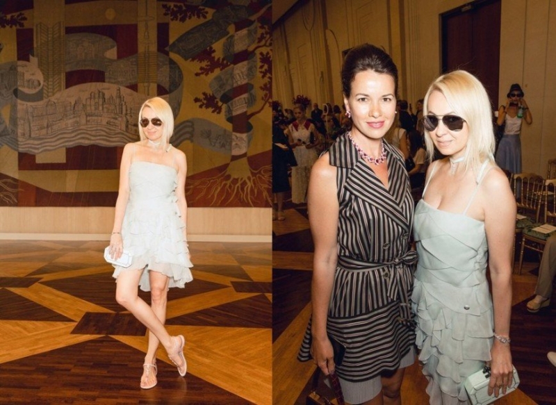 Женщина появилась на показе подруги в коротком легком платье нежно-голубого цвета, главной отличительной чертой которого стал необычный многоярусный покрой. Свой наряд бизнес-леди дополнила сандалиями на плоской подошве и темными очками, которые, по мнению некоторых интернет-пользователей, выглядели в помещении несколько нелепо.