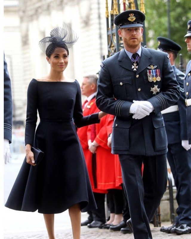 Герцогиня Сассекская пришла на службу в темно-синем платье с вырезом-лодочкой и акцентом на талии, и ее вид резко контрастировал с нежным и спокойным нарядом герцогини Кембриджской. Стоит отметить, что весьма похожий фасон с точно таким же декольте Меган Маркл выбрала в качестве своего подвенечного платья. И если тогда ее образ уступил свадебному наряду Кейт Миддлтон, то на этот раз, напротив, ее выход был признан модным, стильным и в меру дерзким, учитывая строгие требования монаршего гардероба. Рядом с ней икона стиля, всегда утонченная и элегантная Кейт Миддлтон, увы, померкла. А по мнению некоторых критиков, при таком соседстве наряд матери троих детей и вовсе отдавал нафталином.