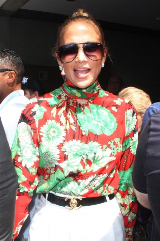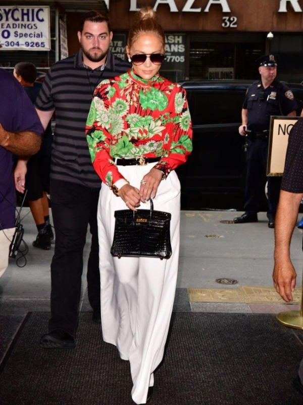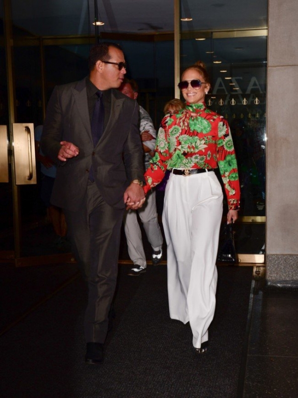 На днях популярную певицу Дженнифер Лопес и ее возлюбленного Алекса Родригеса репортеры сфотографировали, когда они выходили со съемочной площадки шоу «Сегодня». Пара выглядела, как всегда, очень счастливой. Для участия в телевизионном проекте артистка выбрала ставший для нее уже некой визитной карточкой стиль 90-х. 49-летняя Дженнифер щеголяла рядом с Алексом в топе Gucci с ярким красно-зеленым цветочным принтом, контрастность которого она умело подчеркнула с помощью белоснежных брюк-клеш. Черный ремень от Chanel и очки-авиаторы стали гармоничным завершением смелого ансамбля.