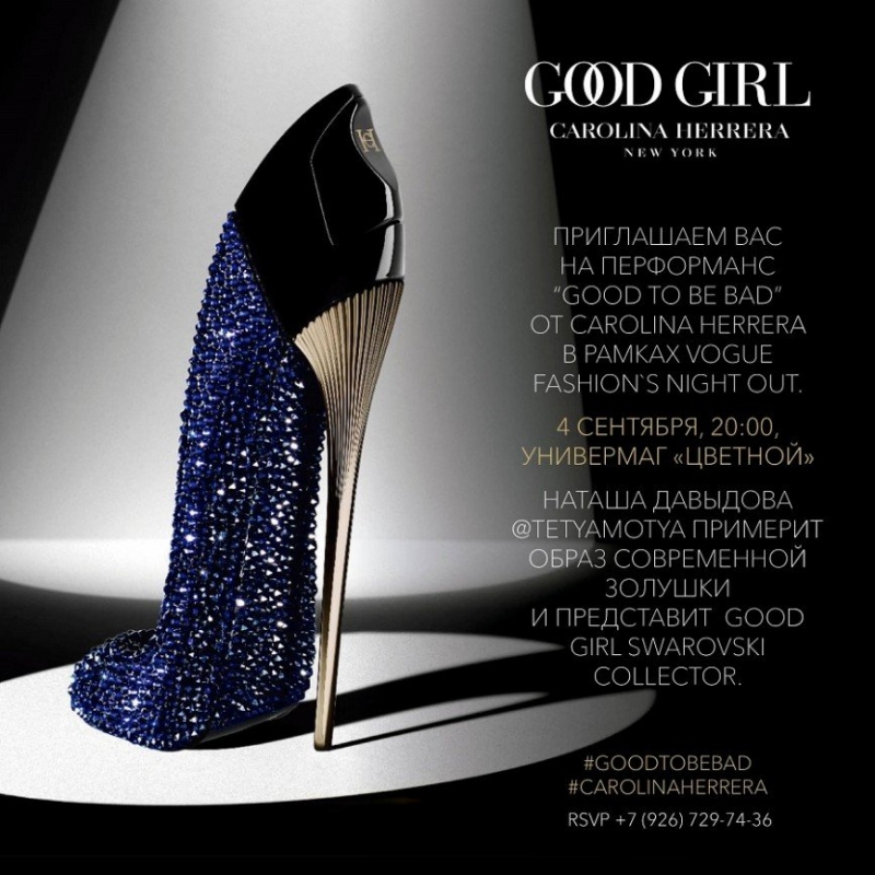 Презентация пройдет в формате перформанса «Золушка ищет туфельку». Но это не привычная нам застенчивая скромница, а Золушка в стиле Good Girl Carolina Herrera. Ее роль исполнит шикарная Наташа Давыдова, известная как бьюти-блогер @tetyamotya. Все гости Vogue Fashion’s Night Out станут свидетелями перформанса, который начнется в 19:30 на 4-м этаже универмага.Золушка в окружении свиты отправится на поиски своей туфельки. Посетители смогут не только наблюдать за масштабным перформансом, но и принять в нем участие — помочь героине в поисках. Самые стильные и яркие гостьи вечера получат в подарок аромат Good Girl Carolina Herrera с автографом Наташи Давыдовой. Действо завершится в «Рив Гош» на 1-м этаже, в корнере Carolina Herrera, где уже будут представлены коллекционные флаконы Swarovski Collector. В этот вечер гости «Рив Гош» смогут также приобрести аромат Carolina Herrera Good Girl в виде классической черной туфельки с автографом Наташи Давыдовой.